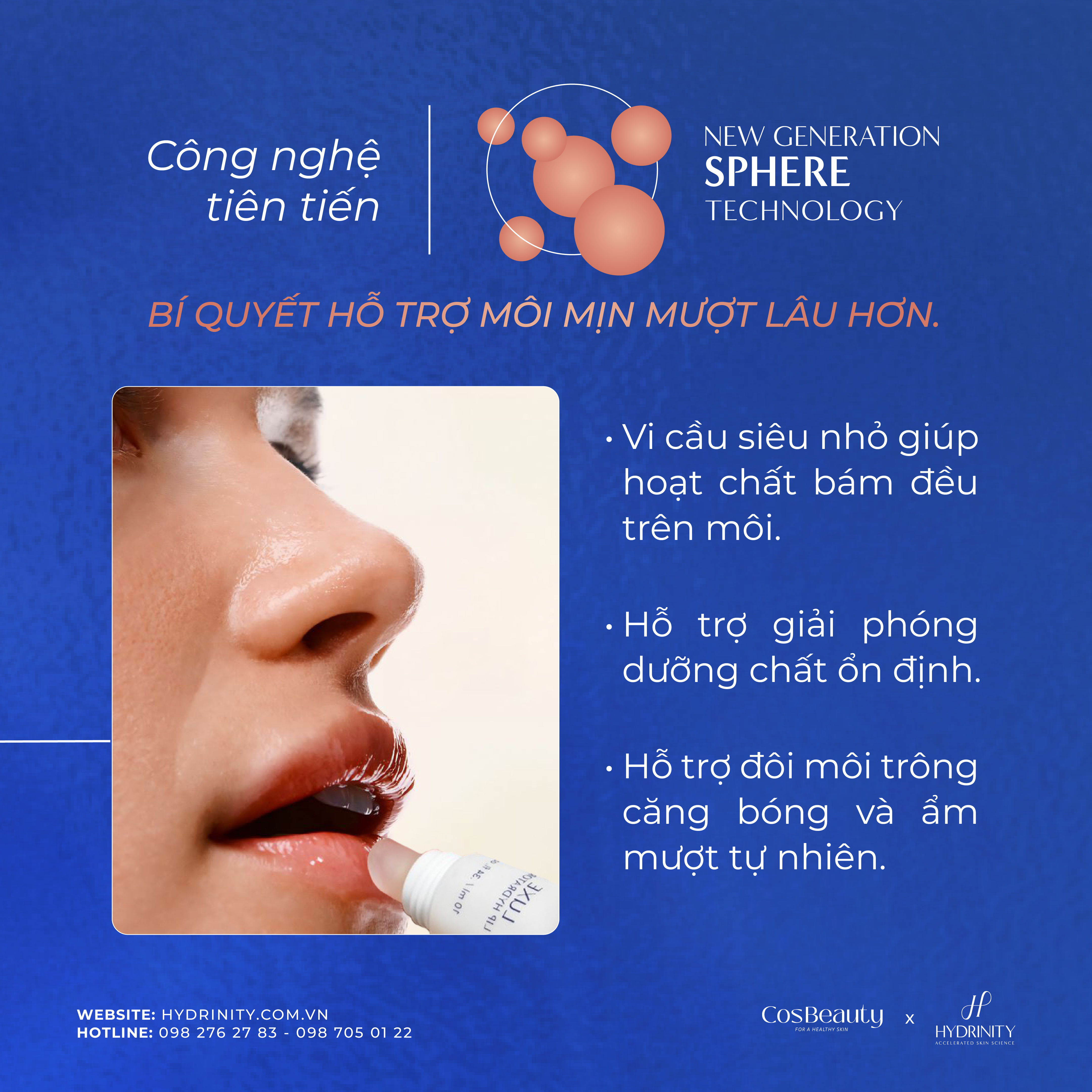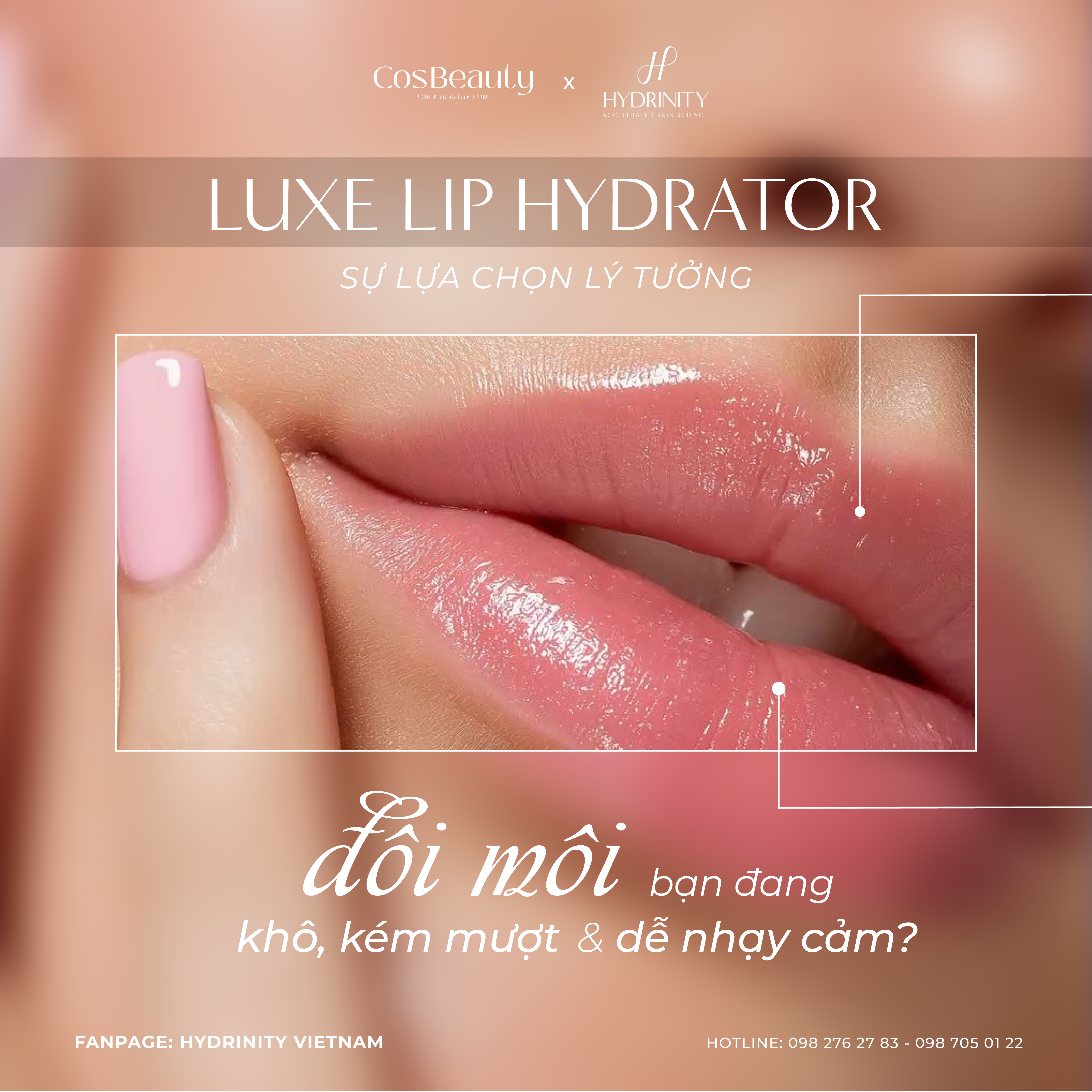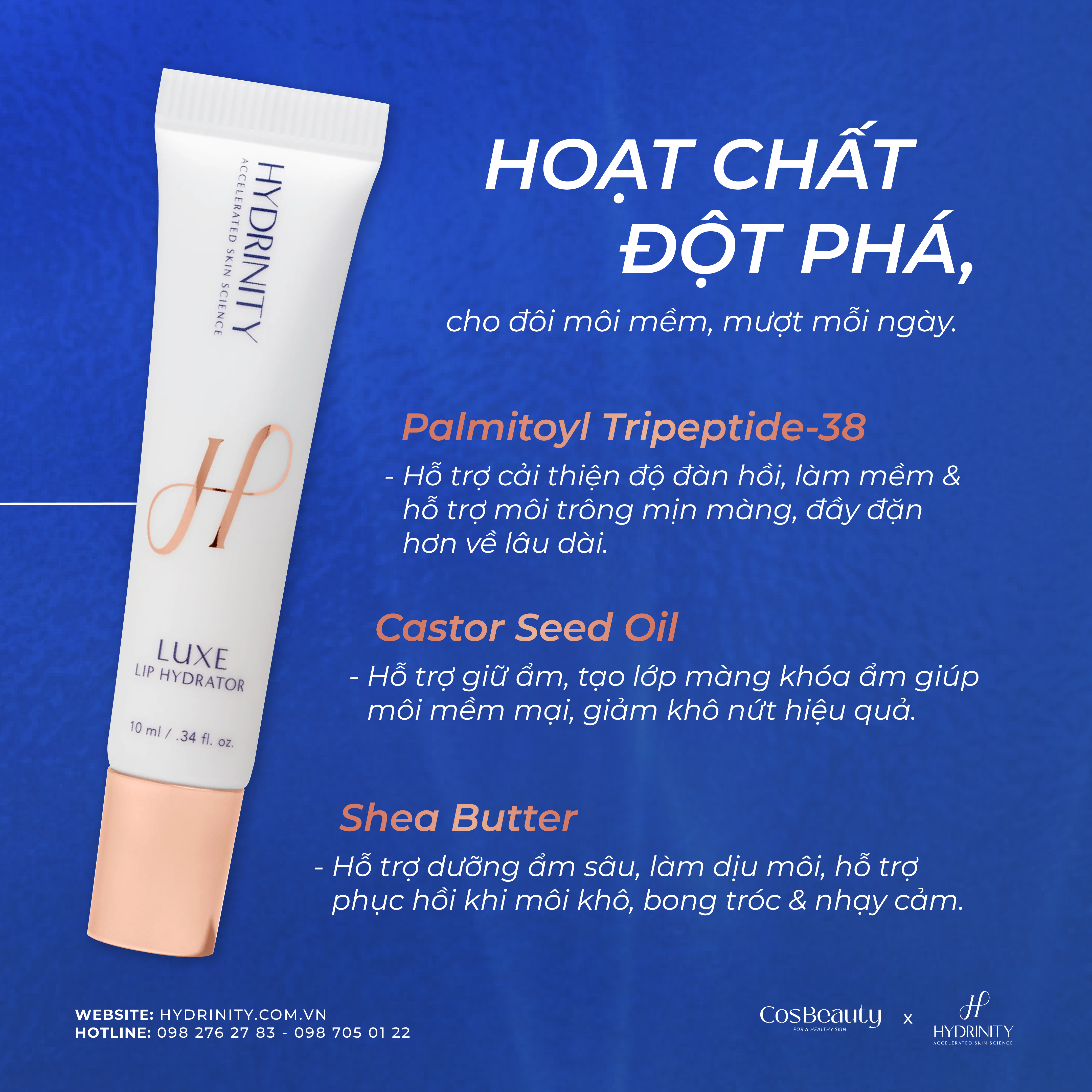 Luxe Lip Hydrator từ Hydrinity được xem là lựa chọn lý tưởng cho những ai muốn làm mềm môi, đồng thời hỗ trợ cải thiện bề mặt môi theo hướng môi căng bóng và mịn màng. Điểm khác biệt của sản phẩm nằm ở sự kết hợp giữa HA trọng lượng phân tử kép và Công nghệ Sphere – giúp dưỡng chất bám đều, thẩm thấu tốt và duy trì hiệu ứng ẩm mượt lâu hơn.