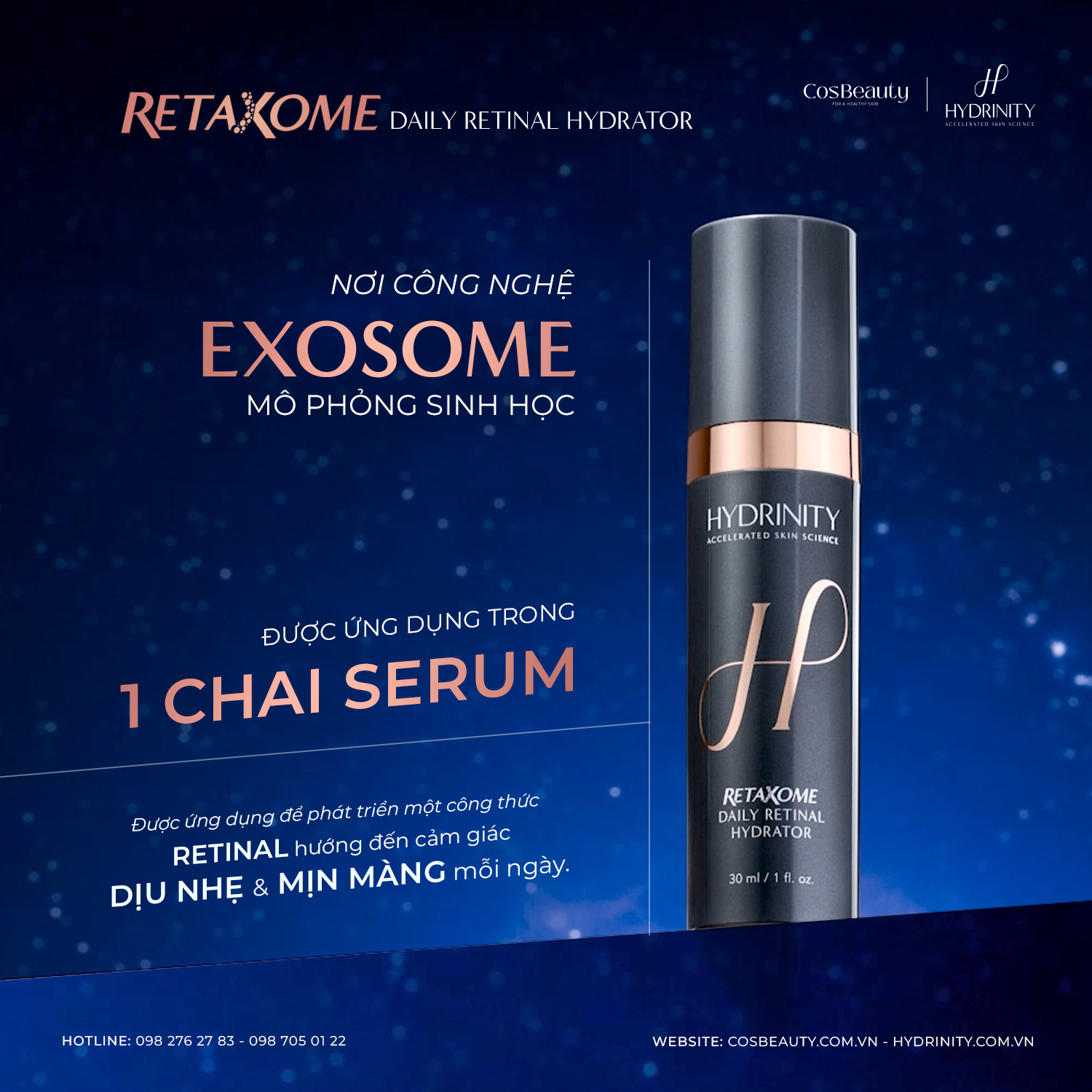 Hydrinity đã phát triển Retaxome Daily Retinal Hydrator với sự kết hợp giữa retinal cải tiến, HA trọng lượng phân tử kép và công nghệ Exosome mô phỏng sinh học, giúp tối ưu khả năng thẩm thấu, đồng thời hỗ trợ cấp ẩm sâu và chăm sóc da chuyên sâu.