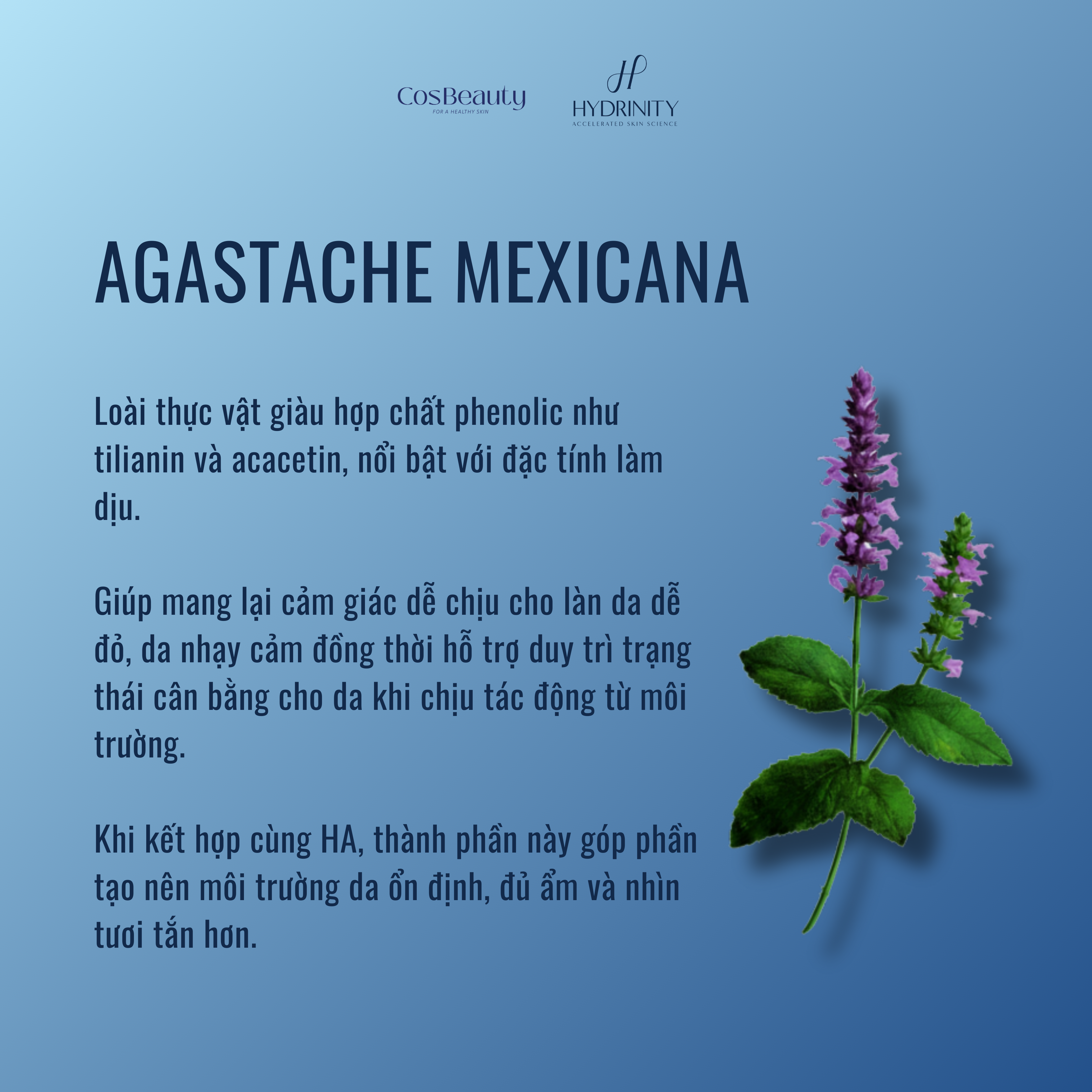 Khi kết hợp với nền HA trọng lượng phân tử kép, Agastache Mexicana giúp tạo nên môi trường dưỡng ẩm ổn định, hỗ trợ quá trình chăm sóc da chuyên sâu.