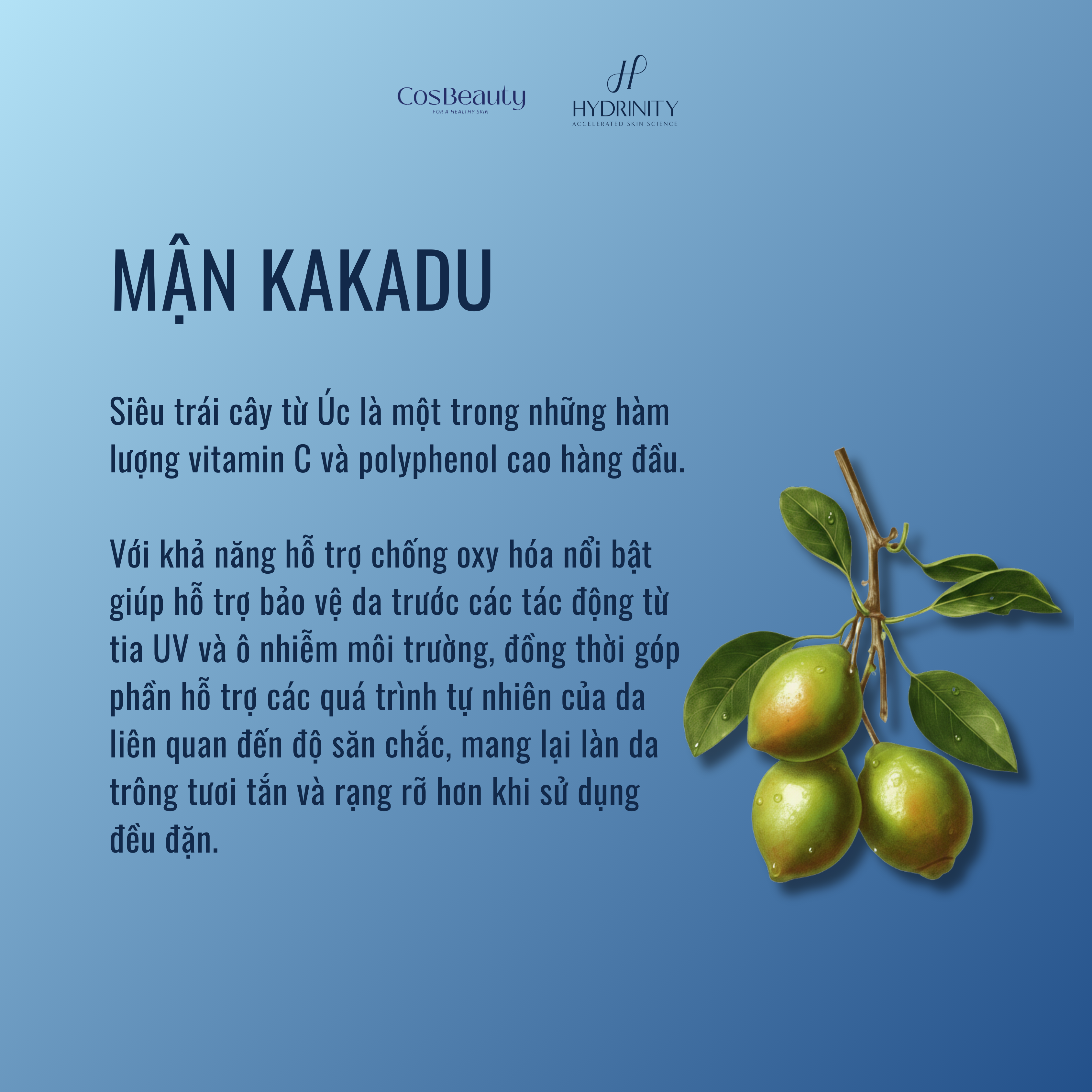 Mận Kakadu là một trong những nguồn vitamin C tự nhiên có hàm lượng cao. Thành phần này thường được sử dụng trong các sản phẩm chăm sóc da nhờ khả năng chống oxy hóa.