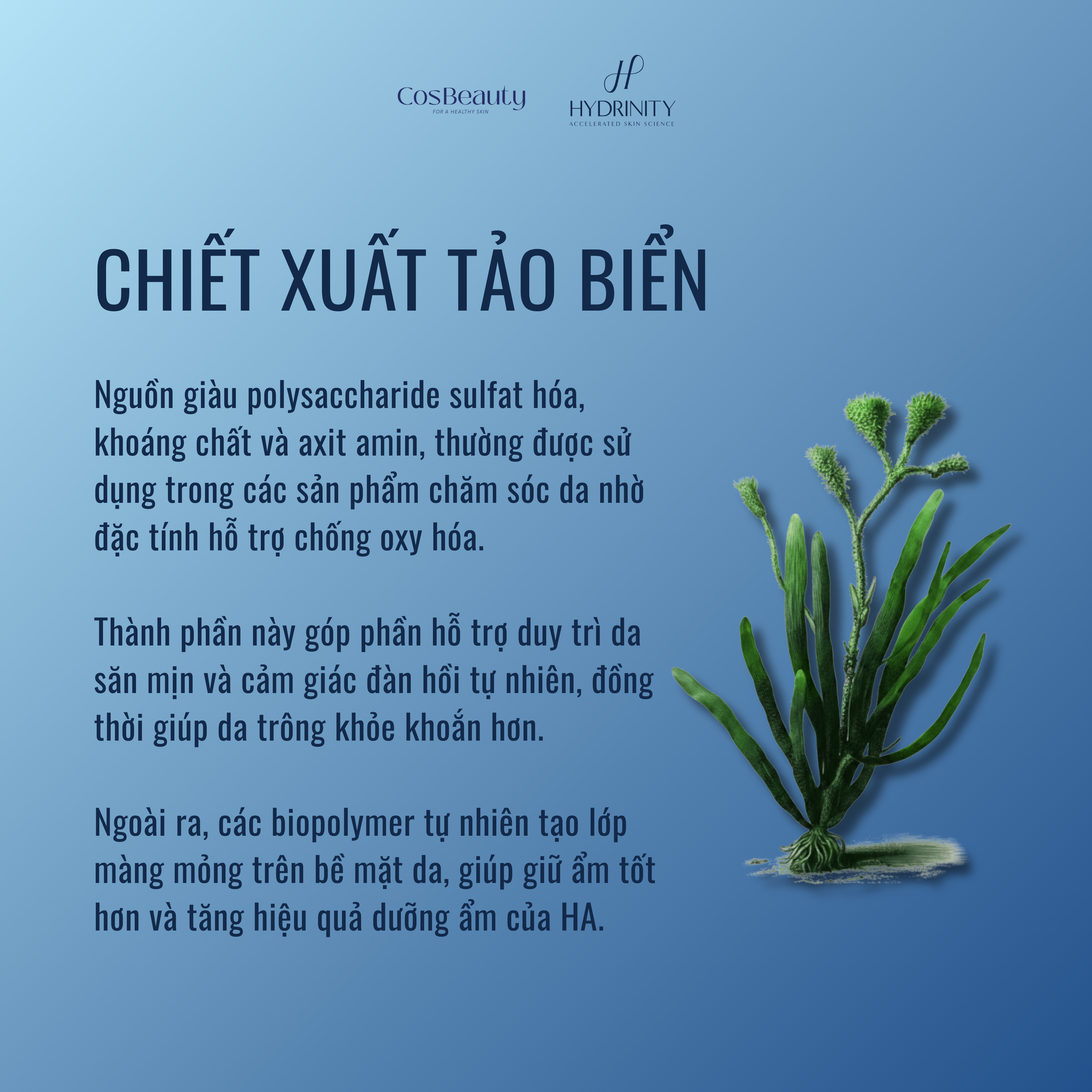 Chiết xuất tảo biển là nguồn giàu polysaccharide sulfat hóa, khoáng chất và axit amin. Trong công nghệ Hydrinity, thành phần này đóng vai trò hỗ trợ dưỡng ẩm và bảo vệ da.