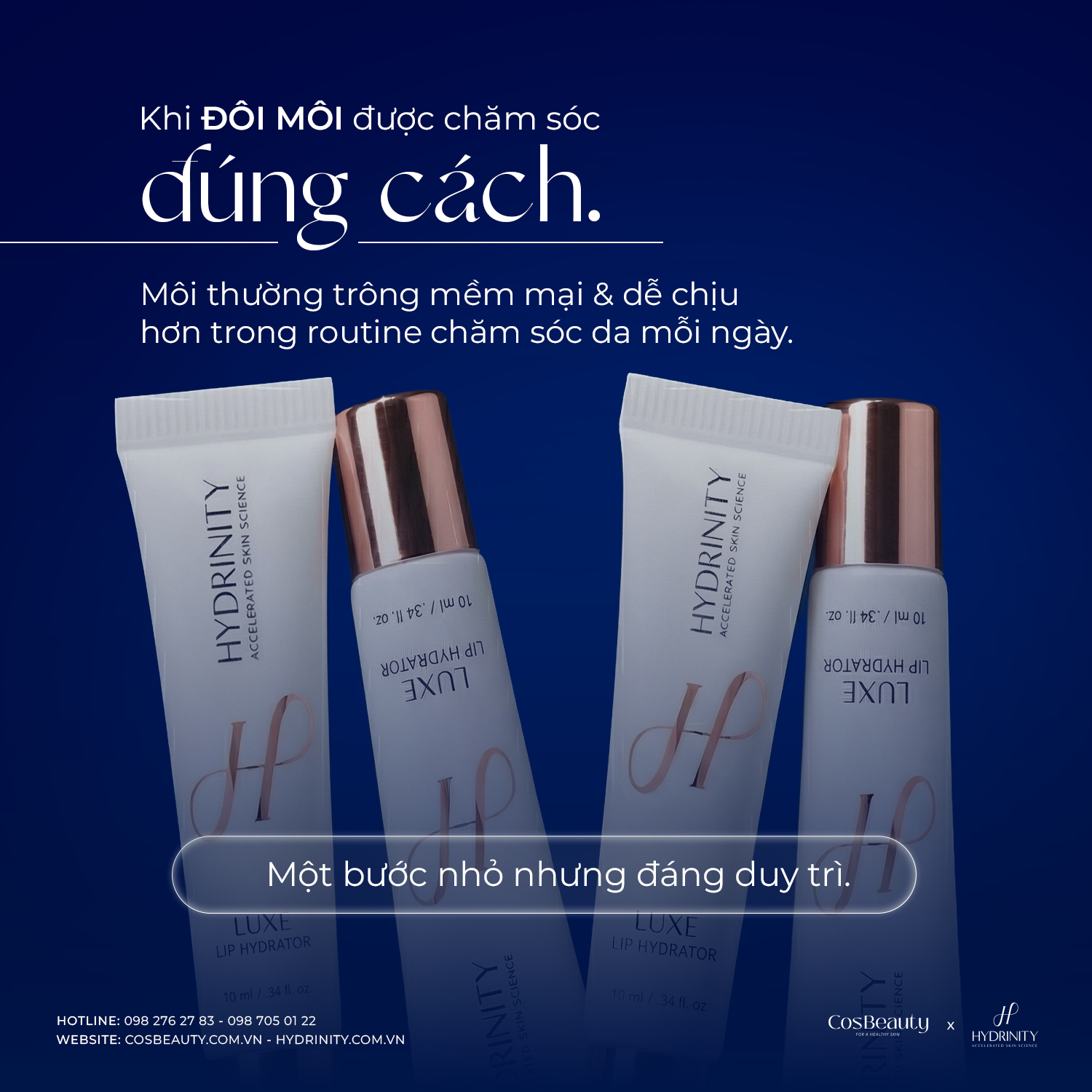 Với HA trọng lượng phân tử kép, công nghệ Sphere và khả năng chăm sóc da chuyên sâu vùng da môi, Hydrinity giúp mang lại cho đôi môi mềm mịn, căng bóng và mịn màng hơn mỗi ngày. Nếu bạn muốn bổ sung một bước nhỏ nhưng hiệu quả vào routine chăm sóc da, Hydrinity Luxe Lip Hydrator là sản phẩm đáng cân nhắc.