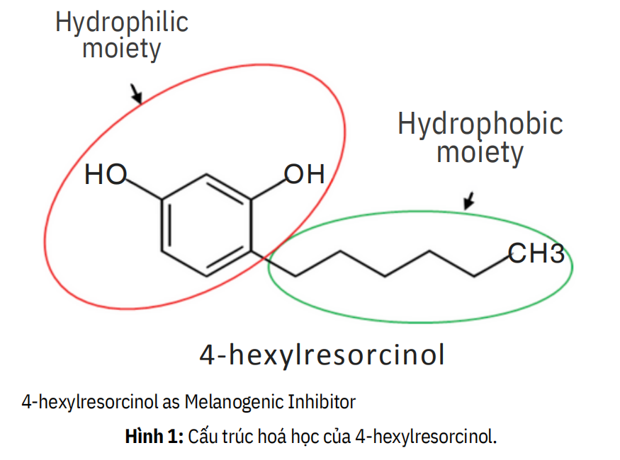 4-hexylresorcinol (4-Hexyl-1,3-benzenediol; 4-HR) là một alkylresorcinol (AR) với 6 methylenes ở vị trí thứ tư được bao gồm trong danh sách các loại thuốc của Tổ chức Y tế Thế giới (WHO) vào năm 1999 (Hình 1). Đó là một hợp chất hữu cơ amphiphilic mô phỏng chất đệm tự nhiên của tyrosinase, tyrosine. Nó là một phân tử tương tự của resorcinol, một hợp chất được sử dụng như một chất kháng khuẩn và chất khử trùng trong việc sử dụng ngoại da [1]. Nó có tính chất amphiphilic, sở hữu một phần hydrophilic và một phần hydrophophic (được làm nổi bật trong vòng màu xanh trong cấu trúc Hình 2). Tính chất amphiphilic này khiến cho 4-HR có thể tương tác với lớp lipid đôi của màng sinh học trong khi phần hydrophilic của nó khiến cho nó có thể chia sẻ proton trong môi trường nước [2,3]. Hơn nữa, 4-HR có tình trạng GRAS (Generally Recognized as Safe), được coi là an toàn và cũng hiệu quả như một chất chống sự browning trong các ứng dụng thực phẩm [4].