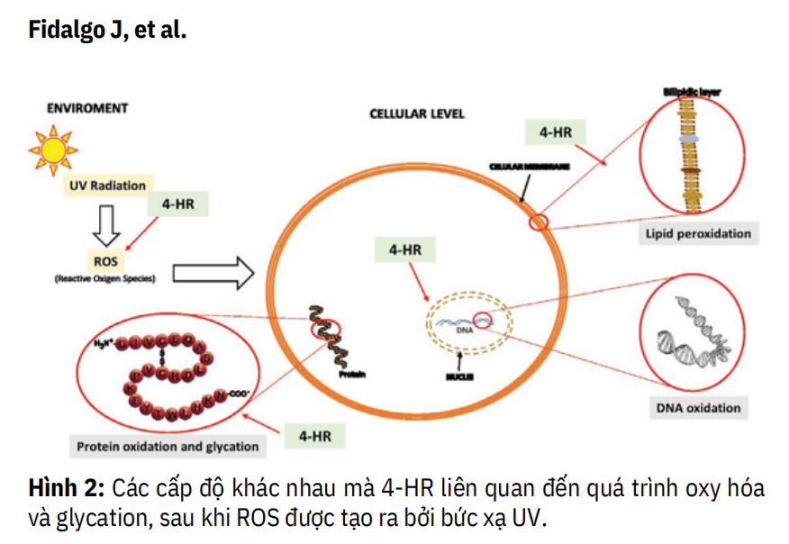 Mặc dù kết quả khá khác nhau ở lớp hạ bì và biểu bì, quá trình lão hóa ngoại cảm được đẩy mạnh đến một mức lớn bởi căng thẳng oxy hóa, gây ra bởi ánh sáng mặt trời bao gồm bức xạ tử ngoại (UV). Bức xạ UV được biết đến có khả năng làm kích thích các loại Reactive Oxygen Species (ROS) ở cấp độ tế bào, dẫn đến căng thẳng oxy hóa tế bào [3,11-13]. Các tế bào da chịu căng thẳng oxy hóa kích hoạt đến mức nhất định cơ cấu chống oxy hóa bao gồm Glutathione (GSH) bảo vệ tế bào khỏi tổn thương oxy hóa cũng như một số enzym chống oxy hóa chính, như Glutathione Peroxidase (GPX) và Glutathione Reductase (GR) [14,15]. Trong các mô hình tổn thương DNA trong bạch cầu loại người do H2O2 gây ra, việc sử dụng 4-HR được chứng minh gây tăng cấp độ GSH nhưng đồng thời của GPX và GR, hạn chế tình trạng căng thẳng oxy hóa và tổn thương DNA [16]. Là một dẫn xuất phenol, 4-HR cũng có thể cung cấp proton cho các gốc tự do thông qua hydrogen phenolic của nó, cho phép nó loại bỏ cả gốc peroxyl và oxy superoxide và giảm peroxidation của lipid [2,17,18]. Cuối cùng, các loại Reactive Oxygen Species cũng có thể dẫn đến các phản ứng oxy hóa của protein [19]. Do tính chất amphiphilic và phần hydrophilic của nó, 4-HR có thể tương tác với cả lipid và protein để giảm oxy hóa của chúng một cách hiệu quả [2,3].