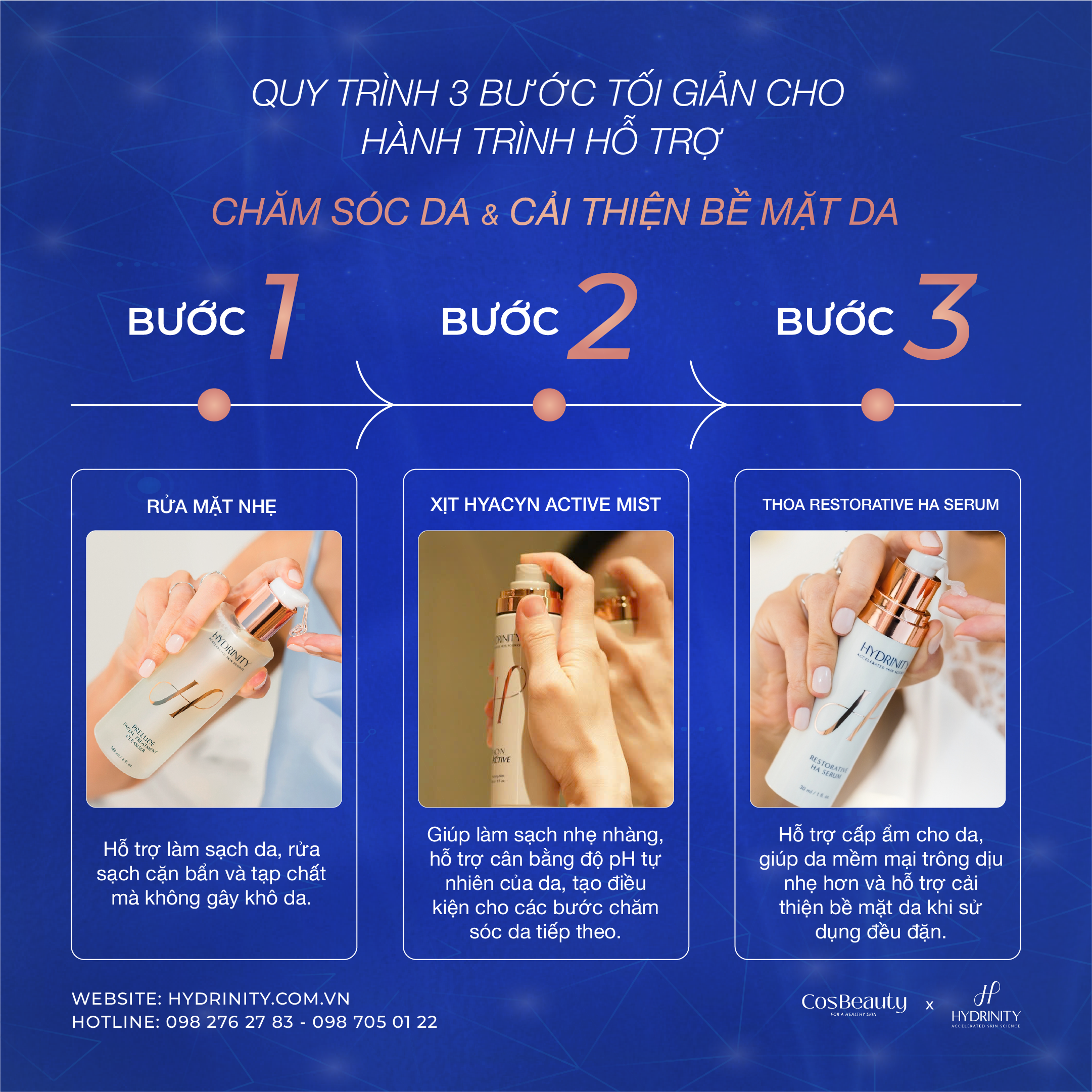 Hydrinity mang đến quy trình 3 bước đơn giản – dễ áp dụng nhưng vẫn đảm bảo hiệu quả chăm sóc da toàn diện: