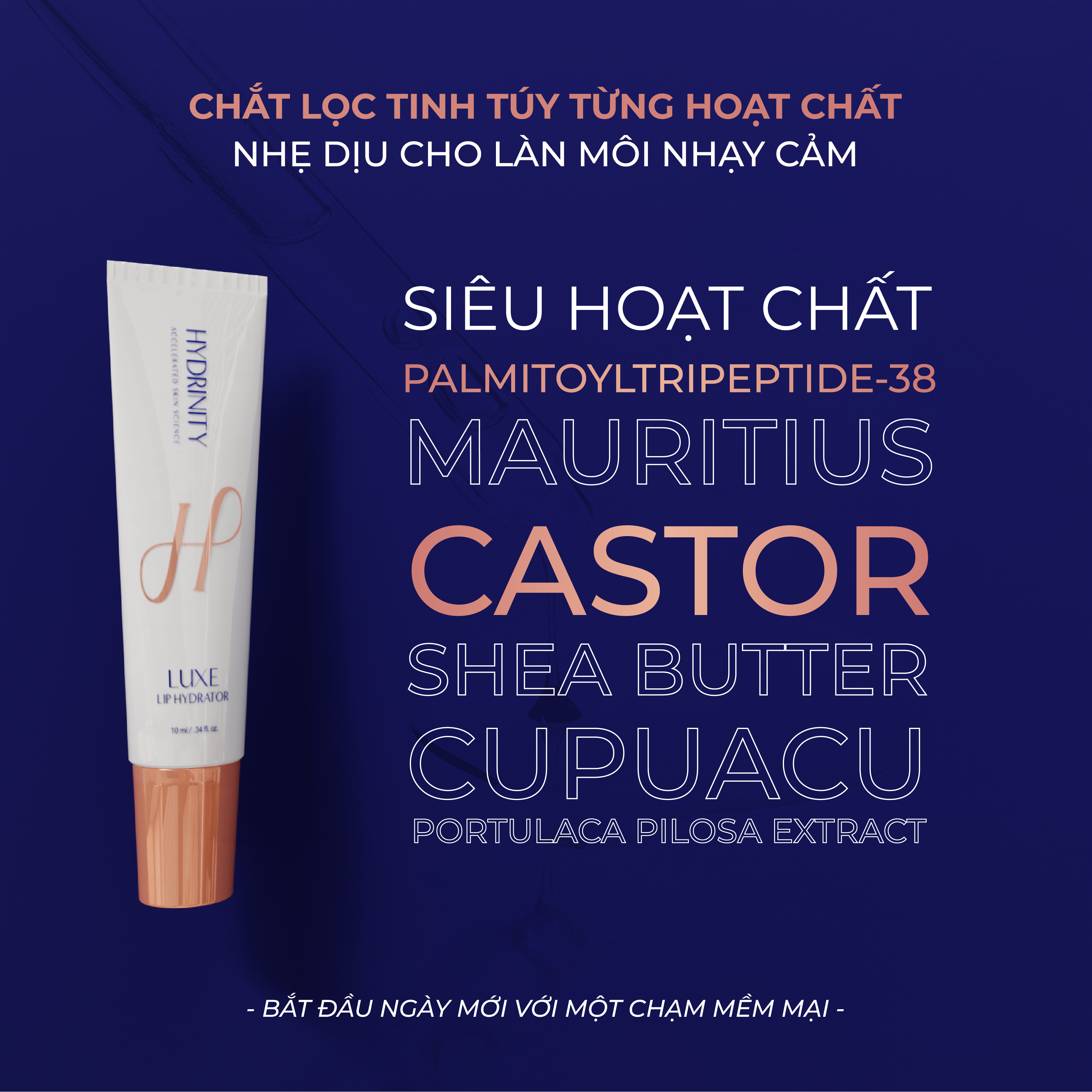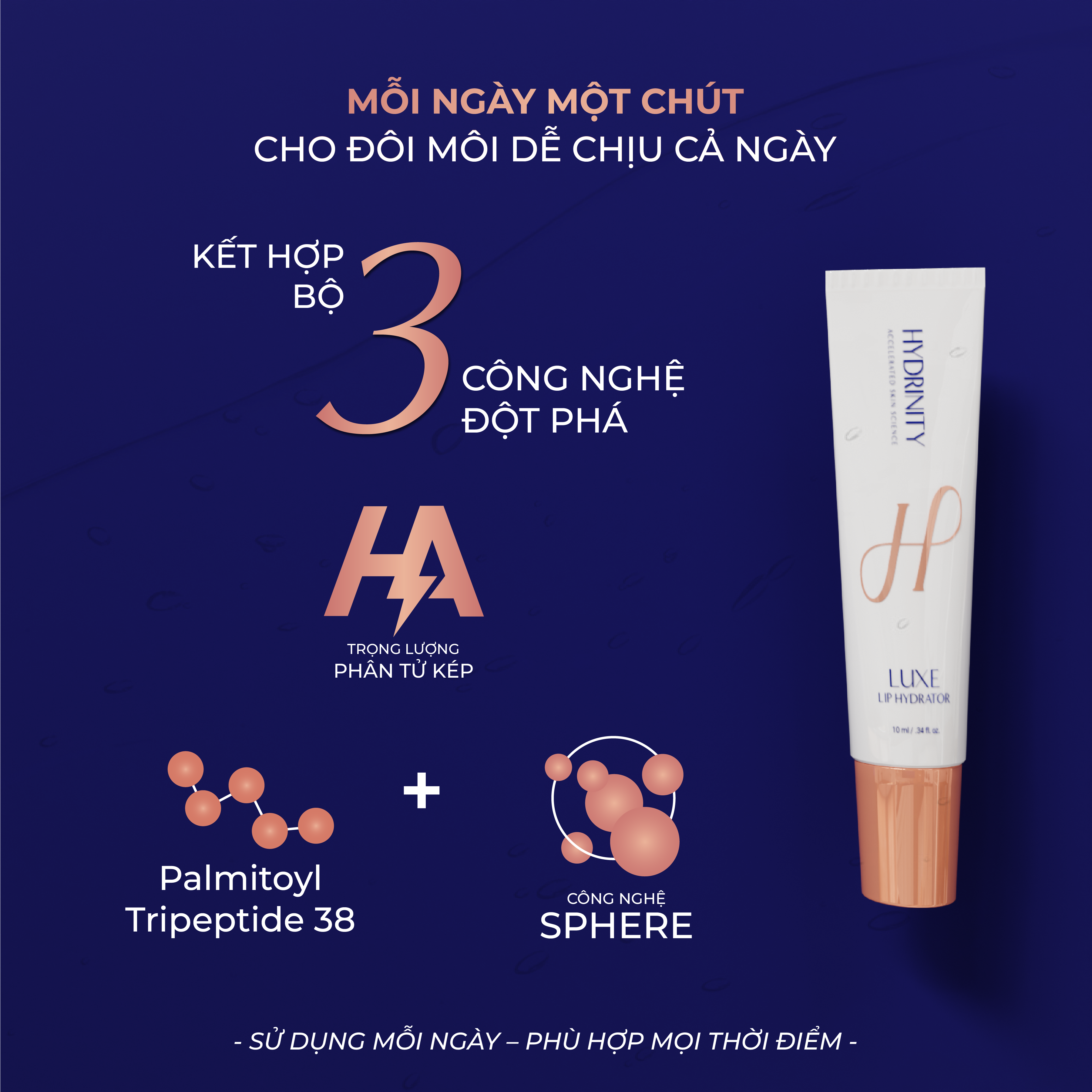 Luxe Lip Hydrator của Hydrinity được phát triển theo tuyến giá trị đó: tập trung vào HA trọng lượng phân tử kép để bổ sung ẩm đa tầng, Công nghệ Sphere cho bề mặt mượt và căng, kết hợp Palmitoyl Tripeptide-38 cùng các chiết xuất nuôi dưỡng – tạo nên trải nghiệm “thoa một lớp, khác biệt cả ngày”.