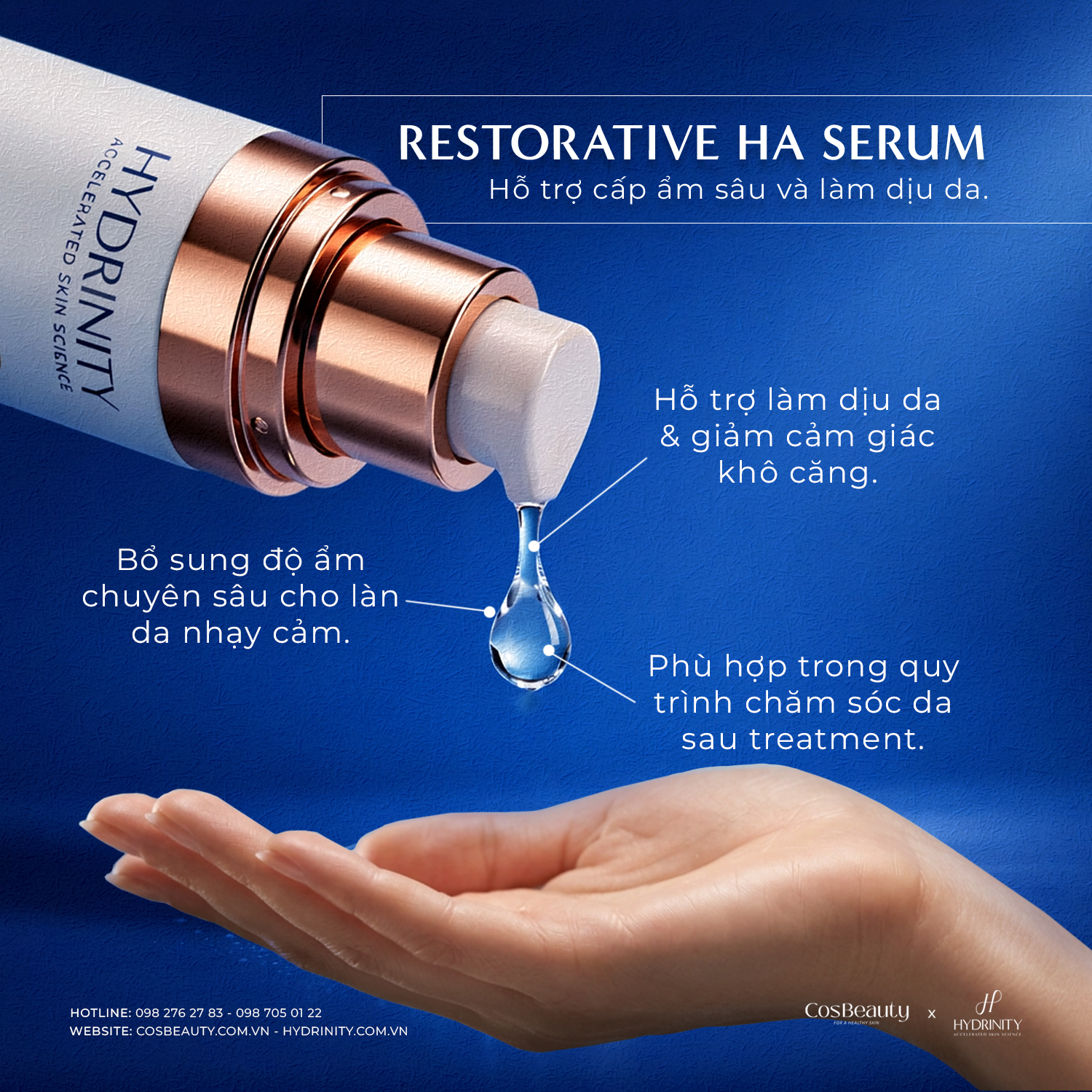 Trọng tâm của giải pháp Hydrinity chính là Restorative HA Serum – sản phẩm được thiết kế dành riêng cho làn da nhạy cảm và da sau treatment.