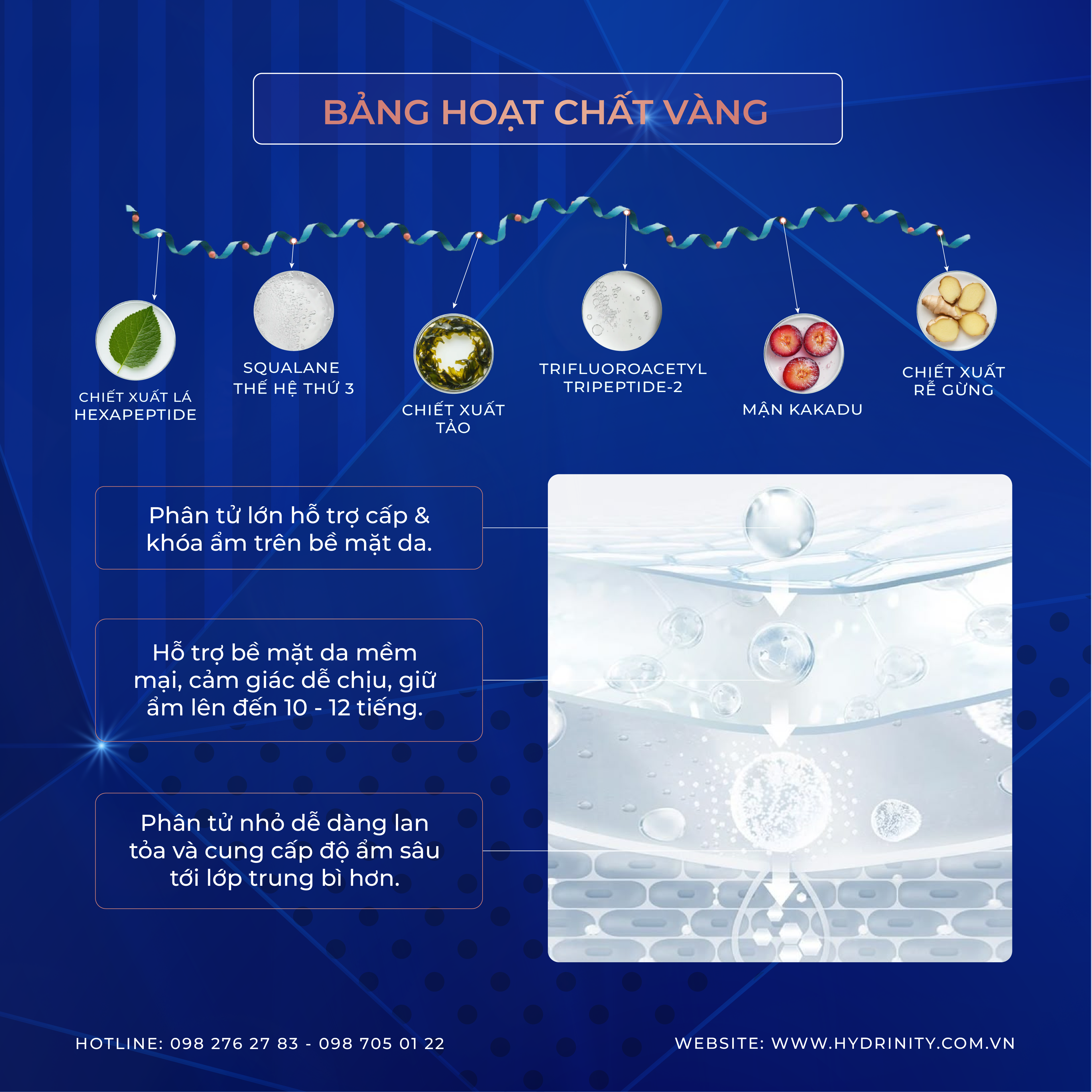 - HA trọng lượng phân tử kép: cấp ẩm tầng sâu, khóa ẩm tầng ngoài giữ ẩm lên đến 10 -12 tiếng.